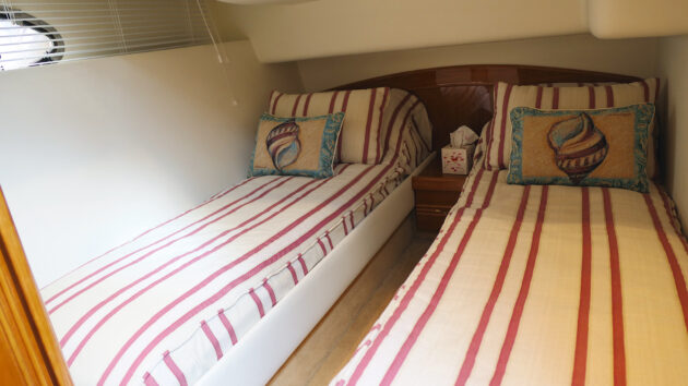 The forward owner’s cabin still looks very clean and smart for a boat of this age
