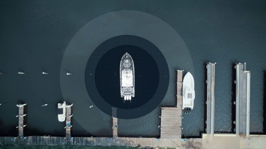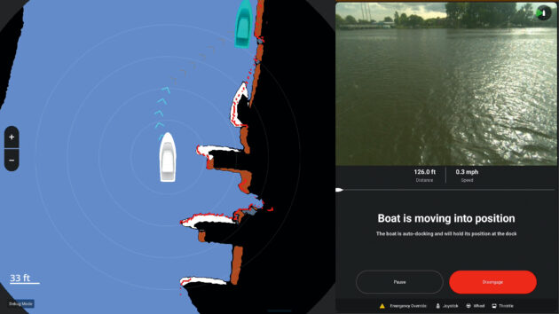 To make it easier for the user to visualise, this is displayed on screen as both a live video feed and a 2D bird’s-eye view with the boat at the centre and colour-coded features representing water, other boats, land and potential docking spaces.