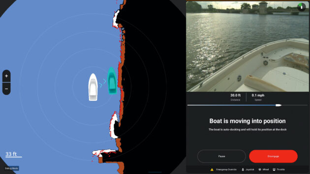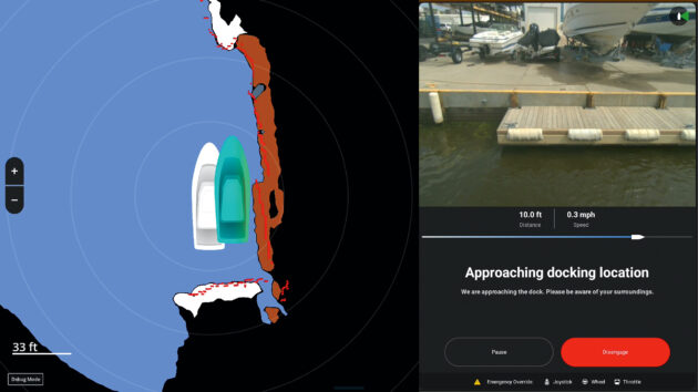 If, during the docking process, the system senses anything unexpected in its path such as a passing kayak or tender, it will either pause or reroute itself. You also have the option to pause or disengage it manually, either by pressing one of the on-screen buttons or by overriding it with the boat’s throttles or joystick.