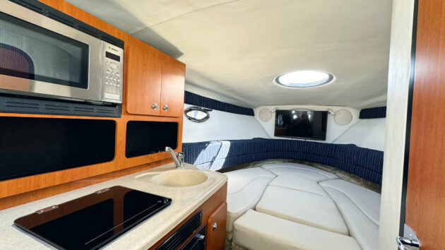For a 25ft sportscruiser, the accommodation is really rather good. It’s the usual horseshoe of dinette in the bow that converts to a double bed and then a galley opposite the heads and a double berth beneath the cockpit, but look at the details. That double berth aft is split off from the rest of the accommodation by a door, making this a proper separate cabin, something you almost never see at this size point. The galley has a proper two-burner gas stove with a grill rather than the token single burner alcohol stove so many boats of this era got, and there are opening windows in the coachroof.