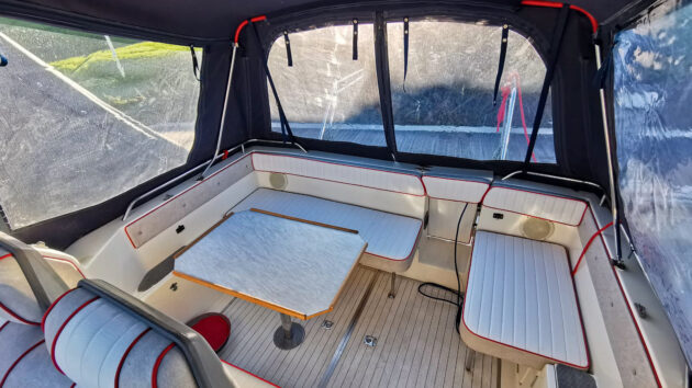 The result of that tiny cabin is plenty of space where you most want it in a boat like this, in the cockpit. The layout is typical for the era, a pair of back-to-back seats either side that fold flat to create sun loungers, and a pair of jump seats either side of the engine box that slot in level with its upholstered top to create another slim sunpad. Updates over the 200 CC include a curved windscreen rather than the previous flat-pane one, plus a full-width bathing platform. Despite its age, it’s still a great looking boat!