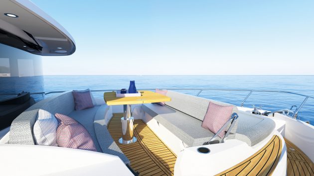 The most obvious visual changes are the larger hull windows and taller gunwales with dramatic cutouts on either side of the cockpit and a more pronounced dip amidships. These are cut off sharply at the stern with a distinctive reverse angle and scalloped corners to emphasise the new glass balustrade.