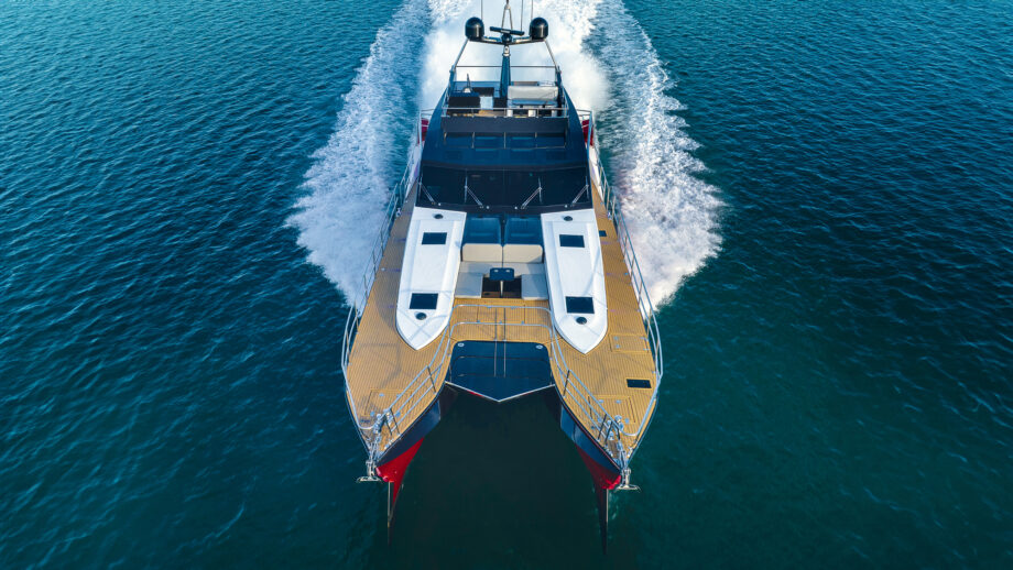 Let’s start with the styling because, while the profile is extraordinarily aggressive, that’s largely a consequence of the hull form. The beam is relatively narrow (for a catamaran), the wave-piercing entry is knife-like, the bridge deck is substantially raised and there’s a cutaway section at the leading edge of the foredeck.