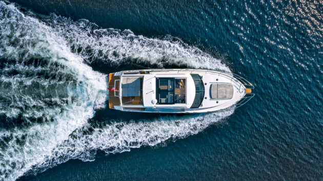 The heel in the turn is extravagant but settled with good grip and excellent pace retention. It’s quick-witted too, responding to small inputs at wheel and throttle like a much smaller boat. And while there’s no real windage on a gentle day from this non-fly version, what tweaks we do make to the trim feel satisfyingly proactive.