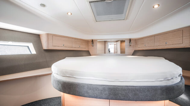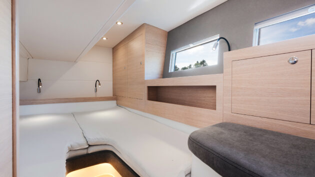 That also creates extra storage space in the vacated port shower cubicle and frees up additional room for a larger midships guest cabin and a little extra space in the forward cabin. But you can also use this port space as a second bathroom if you like. And while it remains true that 90% of people in Norway tend to want three cabins – for the owner, for kids and for guests – the differing appetites of the international market make this two-cabin alternative very worthwhile indeed.