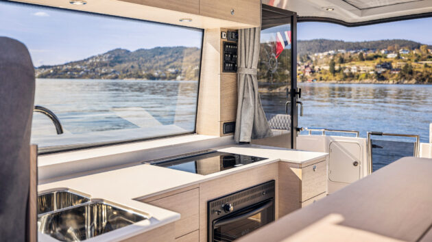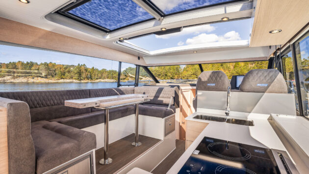 Interestingly, though, instead of the standard provision of a second helm, as on the Viknes 10, the S40 gets the option of a simple joystick on the starboard side. That’s not quite as good for keeping the skipper involved in the party during good weather but it’s perfectly practical for parking manoeuvres and it frees up extra space on the superstructure’s aft bulkhead for an even wider aperture to help unite the external cockpit and internal saloon across the single-level threshold. And if you want to upgrade this station, you can also add an autopilot in the moulding above the folding aft doors.