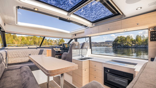 In the absence of a flybridge, it’s clear that this Panorama version of the new Viknes flagship needs to really foreground the benefits of big views and natural light from the main deck saloon and it absolutely does that. You get massive overhead sunroofs, a wide aft bulkhead opening and narrow mullions all-round, creating not just big views on the beam but uncommonly good views of the sky and brightness on a par with anything in the sector.