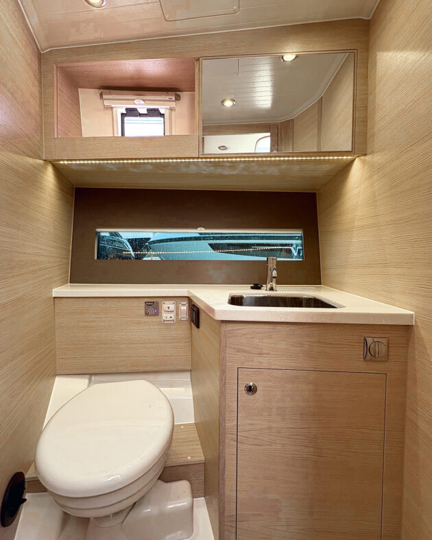 On the other side of the saloon, the galley is no less impressive, and there are some really clever little touches that add practicality to the sheer scale of this unit. The sink lid, for instance, has a dedicated slot to tuck it away out of sight when it’s not needed.
