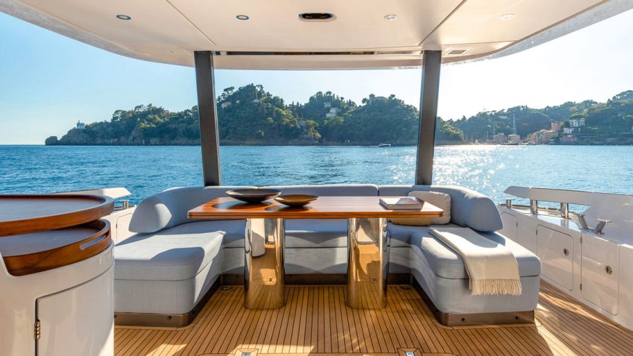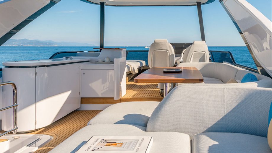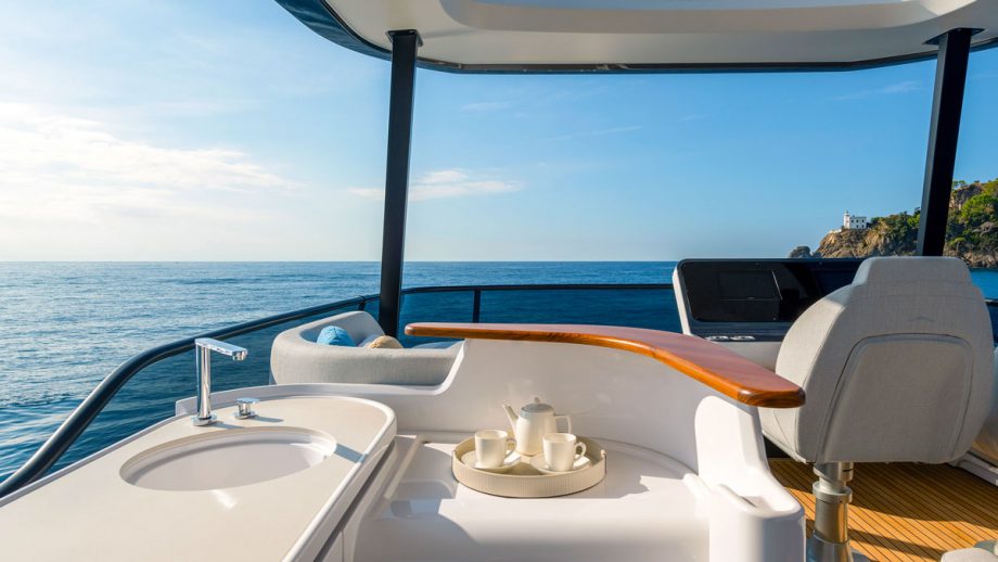 On the bright, balmy morning of our test day, however, the upper helm station was the only place to be, dead amidships on the starboard side of a long, well-furnished flybridge that could accommodate a dozen without too much of a squash.
