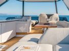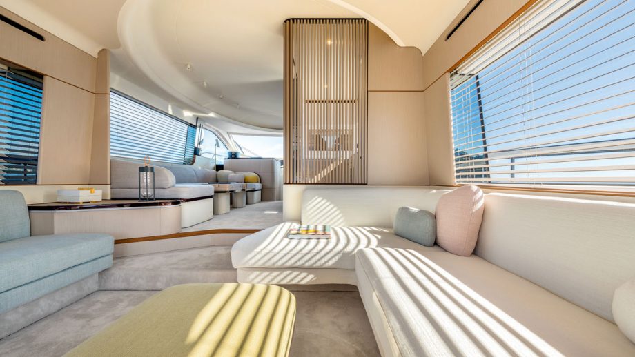 It’s basically all about the galley. In our test boat, the first Azimut 68 off the line, it was installed amidships, enclosed behind a solid longitudinal partition and a slatted aft bulkhead, with a matching slatted window facing forward to the helm, and a sliding door. The more sociable open galley version is very similar, but with the aft bulkhead cut off at counter height and no sliding door.