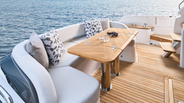 The beach club stern has a drop-down bench, a Seabob locker and an optional transom wet bar but no