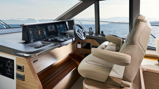 Admittedly, we did have the largest possible gyro option running, a Seakeeper 18 instead of the usual 14, but this didn’t seem to adversely affect the handling, allowing just the right amount of lean in turns while quickly damping any roll at rest.