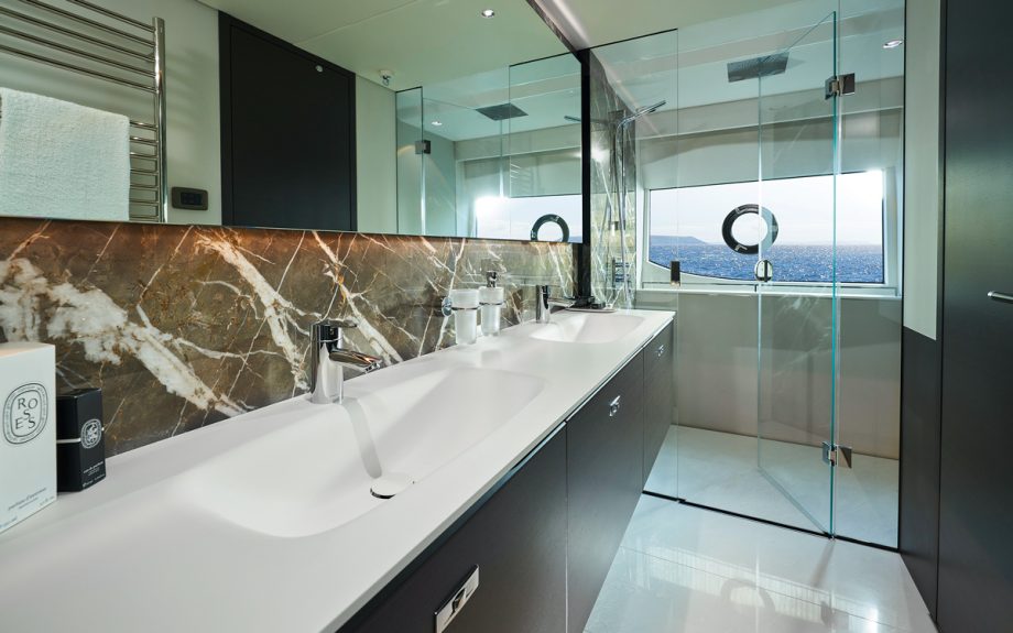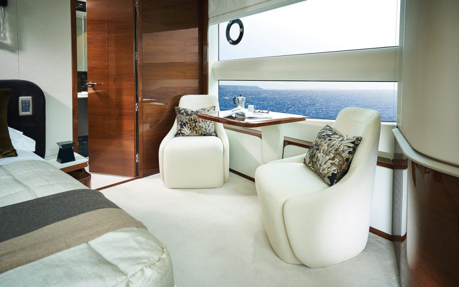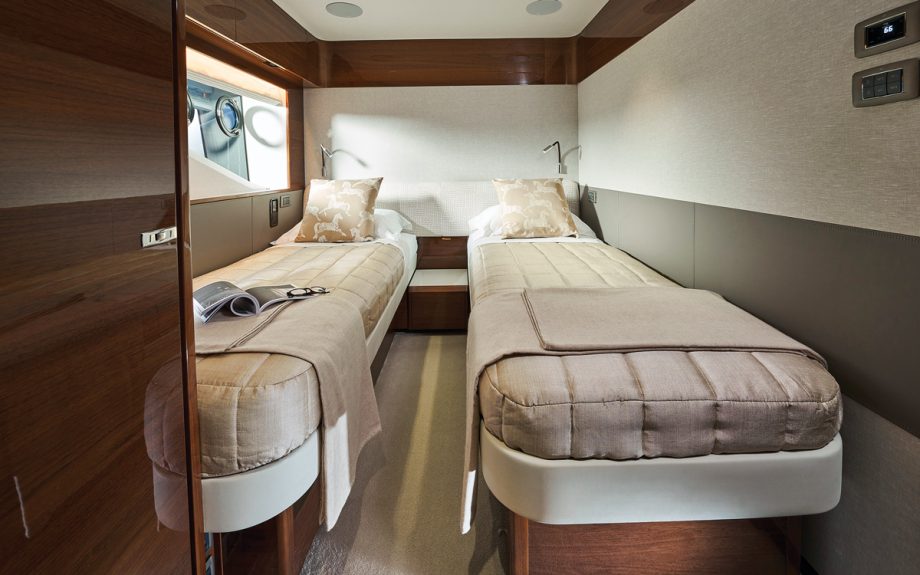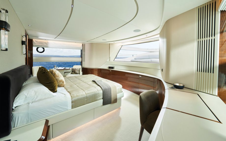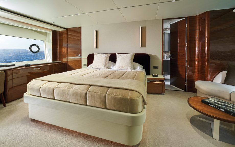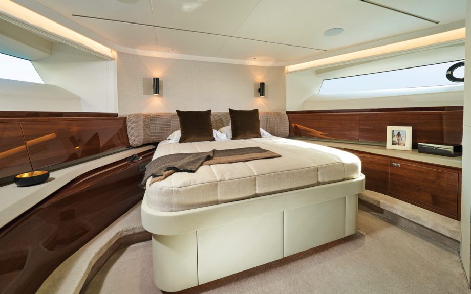 On our five-cabin Princess X95, it was home to a comfortable L-shaped owner’s suite, brightened by substantial side windows and by another big one facing forward, albeit offering rather restricted views onto the foredeck. Headroom throughout the yacht is impressive – 6ft 10in (2.08m) in the master, and 6ft 8in (2.03) as a minimum pretty much everywhere else. The beds, too, are all full-size.