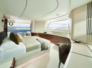It is of course a ‘widebody’ design, a concept very much in vogue at the moment, with a raised wheelhouse and a full-length main deck interior, capped by a flybridge that is pretty much full-length too. What sets it apart from its rivals is its phenomenally bold styling, which was designed by the Princess studio and refined by Pininfarina, where Antony Sheriff happens to hold a board directorship.