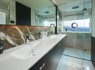 There is so much glass installed that I found myself wondering what it all weighs. Nowhere is its effect seen better than in the main saloon, with its full-height windows each side and glazed sliding doors into the cockpit. Access to the lower deck from here is down a straight companionway to a lobby at the centre of a conventional accommodation layout.