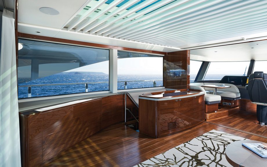 The phenomenal quantities of tinted glass form assertive stripes to reduce – a little – the visual height. That raked windscreen looks serious and businesslike. The full-width upper deck provides a sheltering overhang for the side decks aft, and continues right forward to the stem, accentuating the triple-layered look and cheekily exaggerating the apparent size of the interior.