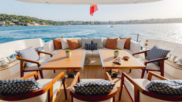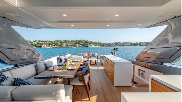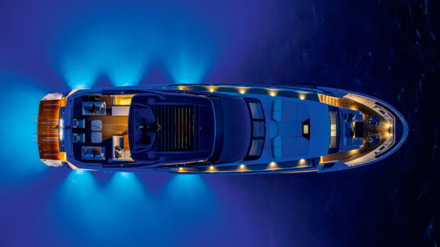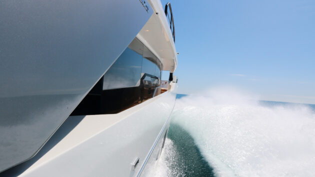 The oversized Sleipner curved fin stabilisers might be helping a bit but at this speed it’s largely the dynamic stability of the planing hull and the sheer might of its 110-tonne displacement flattening all before it. There must be a tiny amount of hull flex, there always is on a GRP boat, but other than the occasional squeak from the deckhead panels there is no evidence of it. It’s only when I step outside and feel the apparent breeze tugging at what’s left of my hair and see the boiling mass of white water being flung out from the propellers that I get a sense of the forces at work as the Needles fade into the distance behind us.