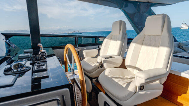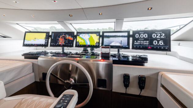 Retreating back to the warm pilothouse, I sit and watch the miles roll effortlessly by. The shallow, heavily raked windscreens and chunky mullions do compromise visibility to some degree but that is largely offset by the multitude of MFDs allowing you to keep an eye on the radar, chartplotter and engine data.