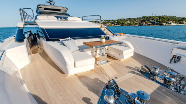 This creates more room inside for the saloon and the owner’s cabin at the expense of having to hang some portside fenders from the flybridge. This isn’t as onerous as it sounds, as the raised side deck also slopes down to the bow. As well as enabling crew to ferry fenders to and from the bow locker, this also allows guests to flow between the flybridge and foredeck lounge via the elevated forward sunpads.