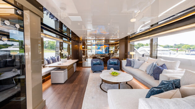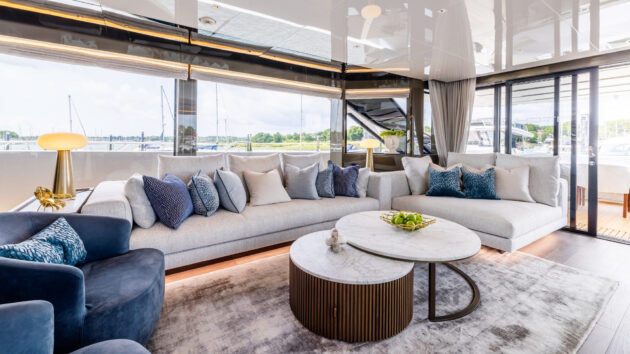 The benefits of that asymmetric layout really make themselves felt when you step inside the sliding glass doors. Instead of the usual long thin corridor of a saloon with seating at one end and a dining area at the other, it’s noticeably wider, with room for a dining table along the port side and sofas to starboard.