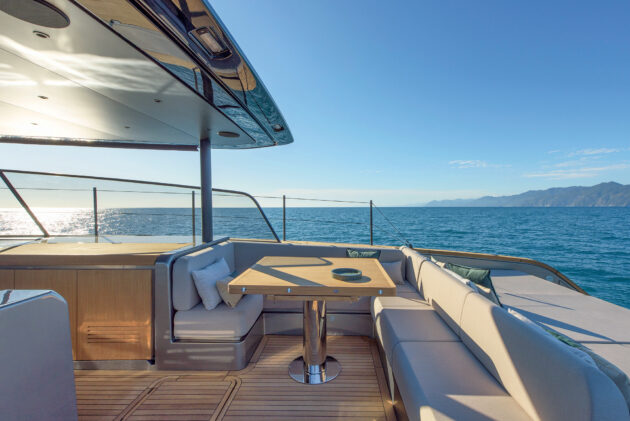 The only shame is that the hard top doesn’t extend this far aft so you’ll need to erect the optional bimini if you want to stay out of the sun while eating.