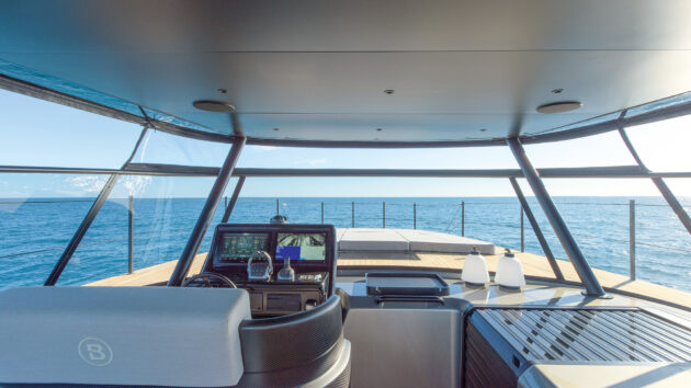 Before putting it through its paces it’s worth taking a moment to appreciate the BGF45’s other assets – it may not have any direct rivals but it still has to offer much the same functionality as more conventional monohull sportscruisers from the likes of Pardo, Fjord, Solaris and Sunseeker. After all, at around €2.1m ex taxes for a sensibly specced boat it’s in the same financial ballpark as a Pardo 50 or Superhawk 55.