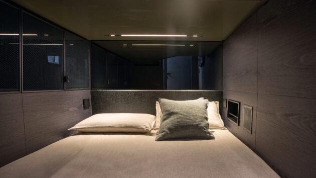 With the structural engineering of the deckhead deliberately left on show and the locker doors alongside the bed made from a lightweight honeycomb material sandwiched between thin layers of clear acrylic, it all feels very high tech, like sleeping inside a surprisingly luxurious race boat.