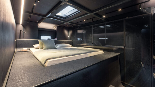 To make that possible the bridge deck linking the two hulls is just deep enough to squeeze in a bed – any deeper and it would risk impacting with waves. As a result the mattress itself has to be mounted on a tall plinth with several steps up to it. Surrounded by a rather hard, black composite frame with limited natural light from the two small hull windows and a deliberately dark colour palette, it’s not the softest or most welcoming of environments, but there is something rather cool about it.