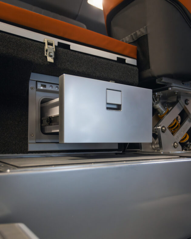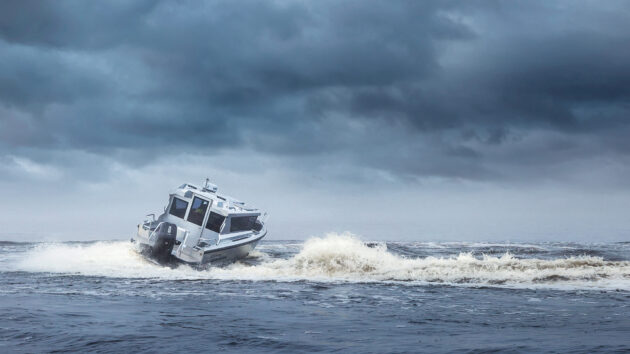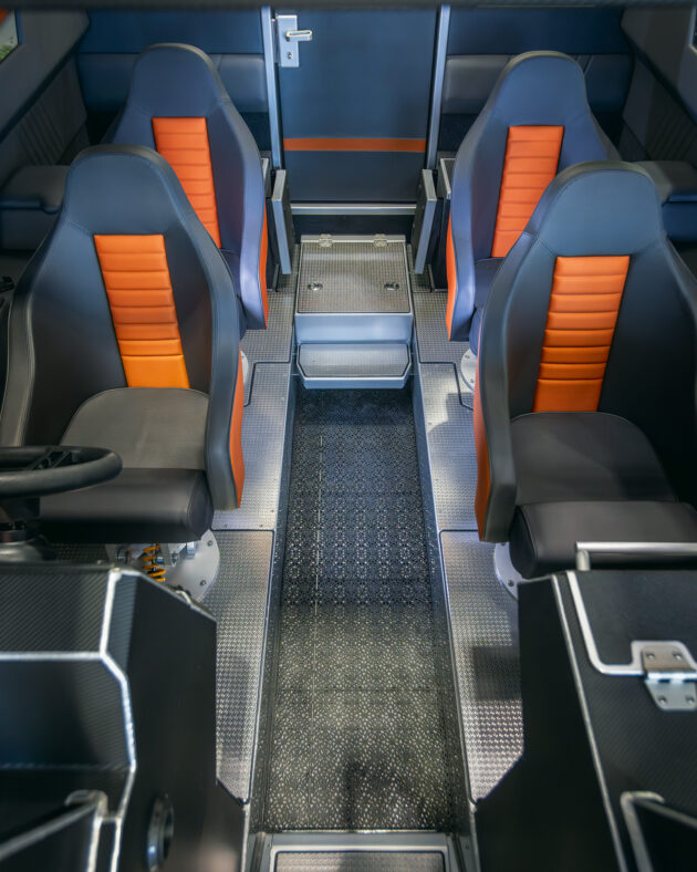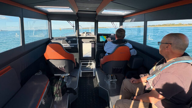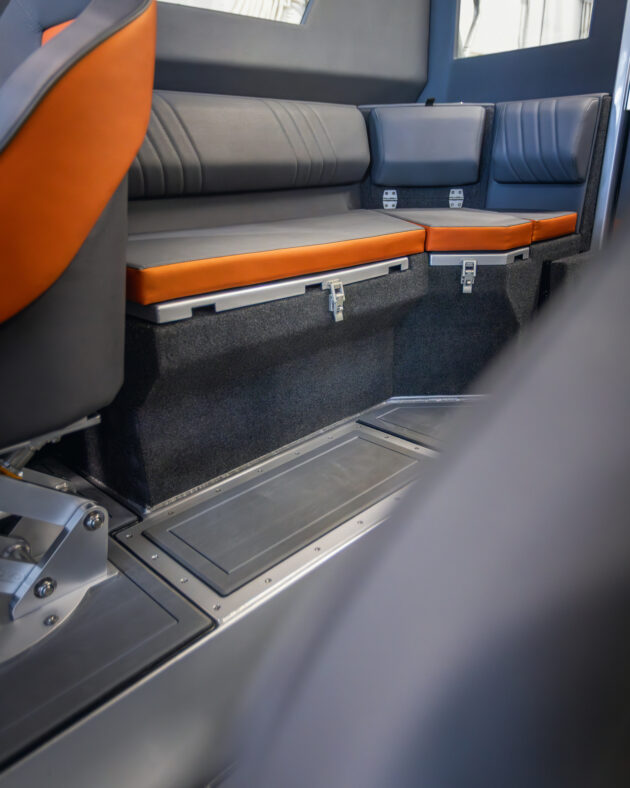 It’s a really quiet boat, too, particularly by the standards of aluminium. The bulkheads, like the storage spaces, are lined with noise-damping fabrics and, when the various doors and hatches are shut, that pegs the decibel readings back to the high 70s, even at the very top end. The big views, the bright natural light, the voluminous cabin and the impact-mitigation seats all collaborate in that to deliver a drive far more refined than you might anticipate from its tough looks.