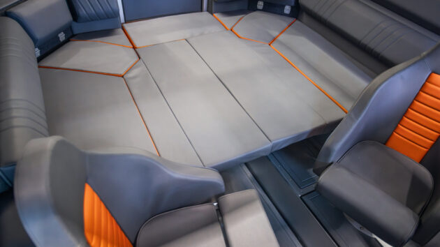 Chuck in a purposeful reverse screen and welds that are left uncovered by vinyl wraps and you’re left in no doubt what this boat is about.