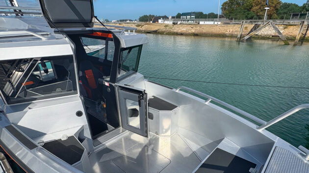 That said, one thing that does limit the joy of the drive is the design of the test boat’s doors. The aft door is hinged (rather than sliding) with a magnetic catch, so you can’t leave it open underway. The glazed two-part bow door is also imperfect.