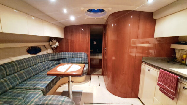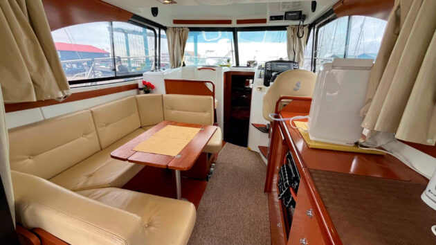 There’s a heads down here as well of course, but the key to such generous lower deck accommodation for a 30ft boat is putting the galley in the saloon on the main deck, behind the helm seat. There’s a dinette opposite, and a neat forward-facing seat alongside the helm.