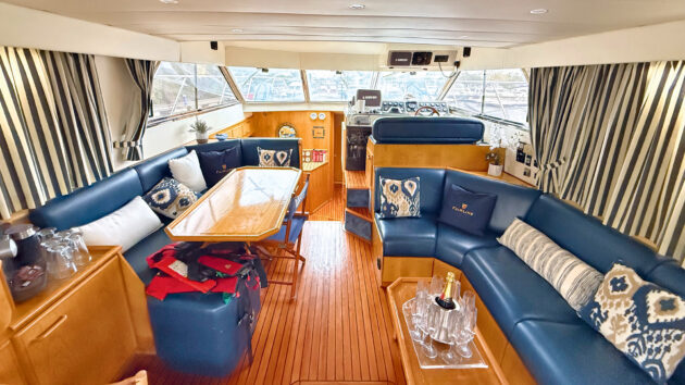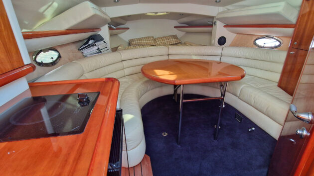 A good looking boat, it is again very similar to the Princess in the cockpit layout, other than a single helm seat where the Princess had a double, compensated for by a larger seating area next to it.